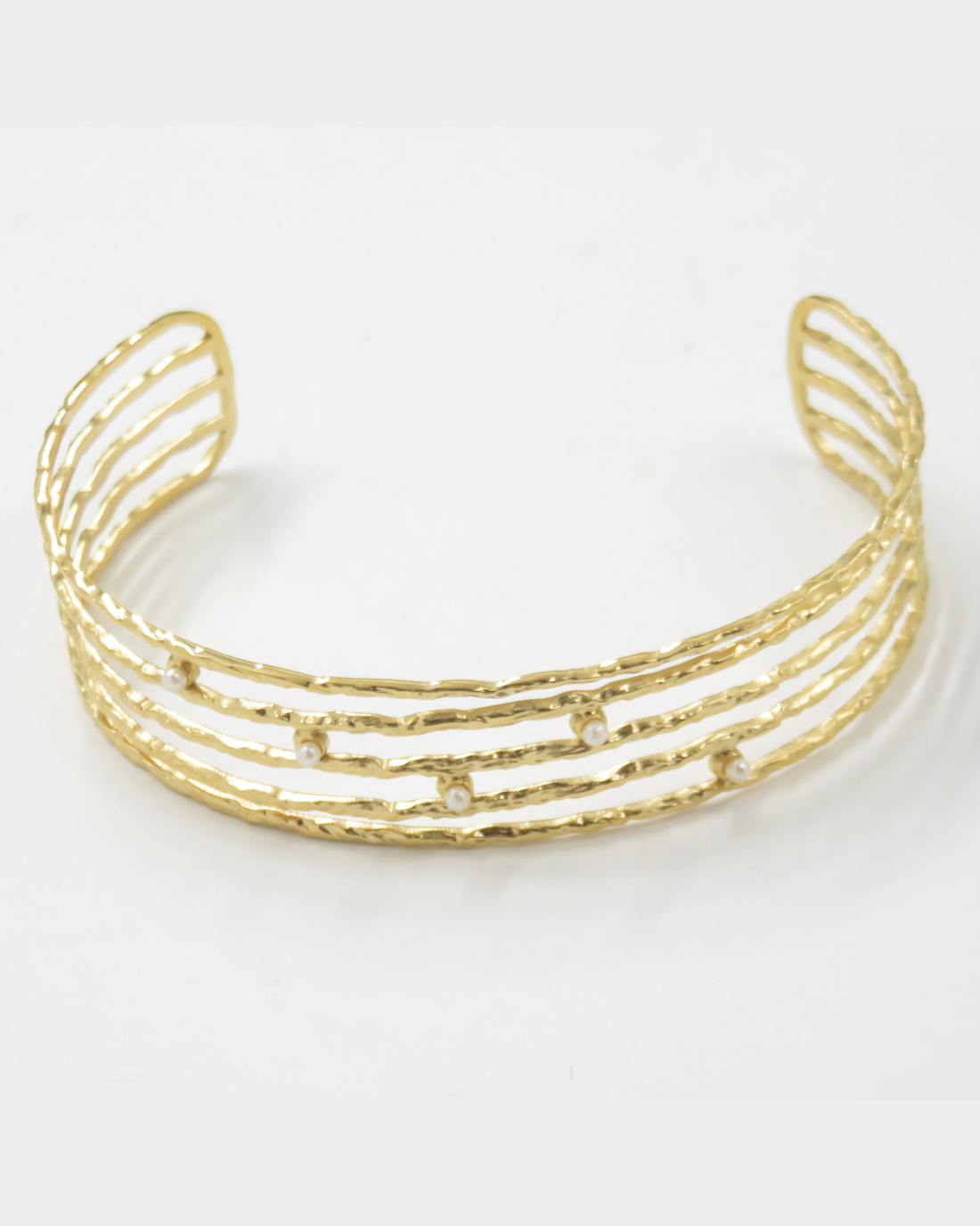 Forbes verbindet klare Linien mit edlem Glanz: Mehrere feine, gehämmerte Edelstahlstränge umschließen das Handgelenk und...