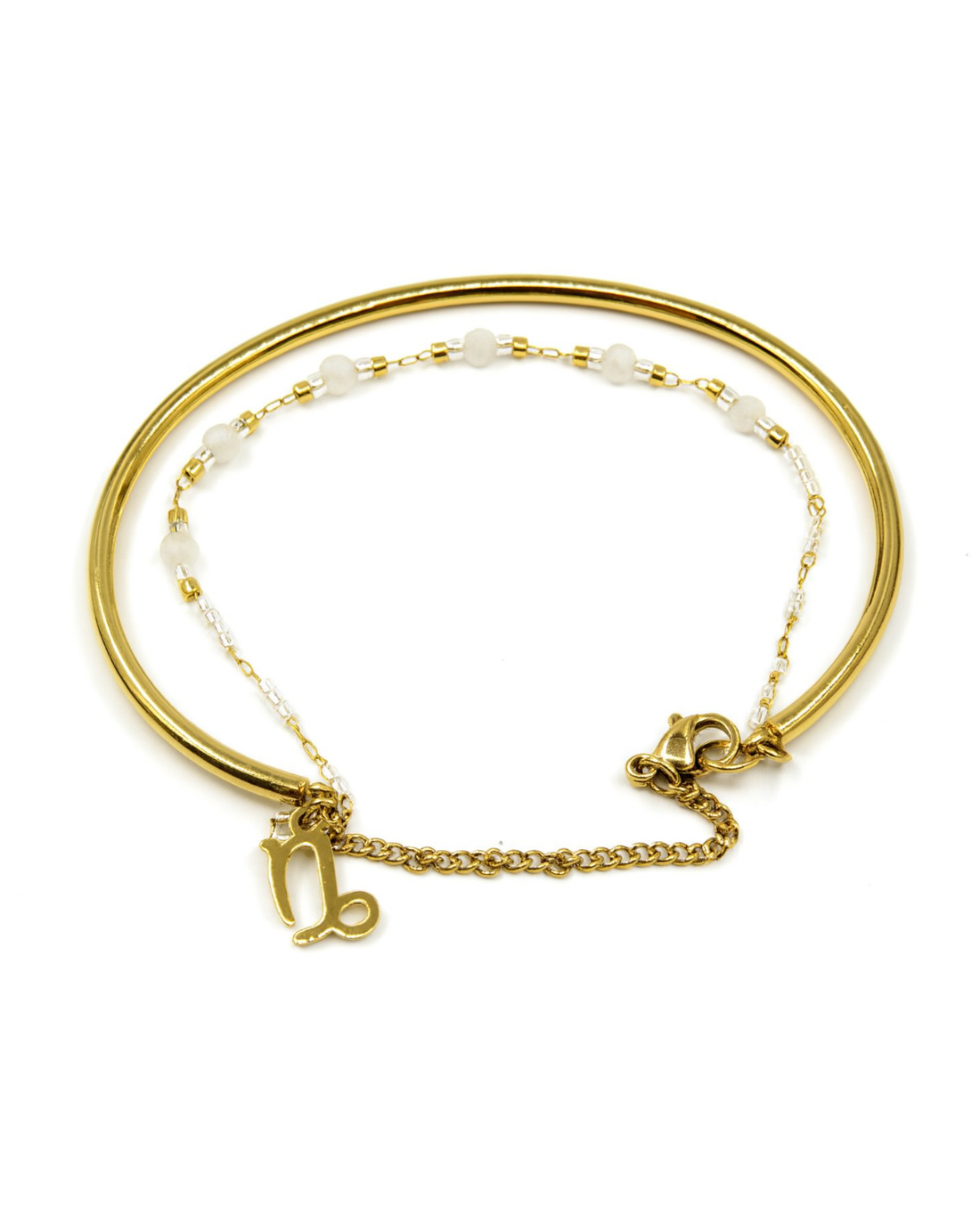 Clare verbindet eleganten Minimalismus mit zarter Symbolik. Der hochwertige Edelstahl-Armreif wird durch eine feine Perlenkette...