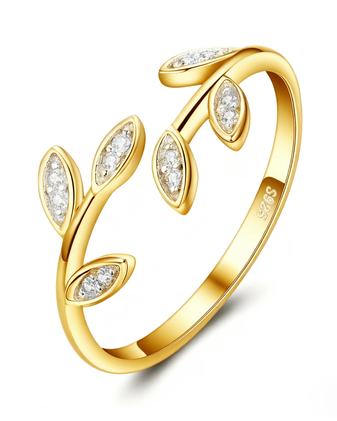 Hopey strahlt natürliche Eleganz aus: Zarte, blattförmige Elemente mit funkelnden Zirkoniasteinen umspielen die filigrane Ringschiene...