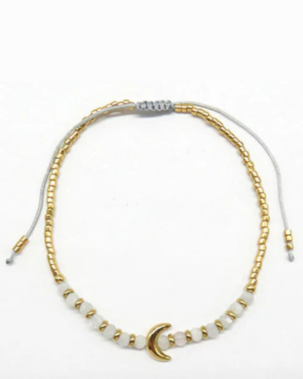 Lutana kombiniert filigrane Beads mit einem eleganten Halbmond-Anhänger und sorgt so für einen dezenten, aber bedeutungsvollen Look. Veredelt mit fein gearbeiteten Glasperlen, ist es perfekt für den Alltag wie auch für besondere Momente. Dank des verstellbaren Verschlusses passt es sich jedem Handgelenk bequem an und wird schnell zu deinem neuen Lieblingsbegleiter.