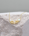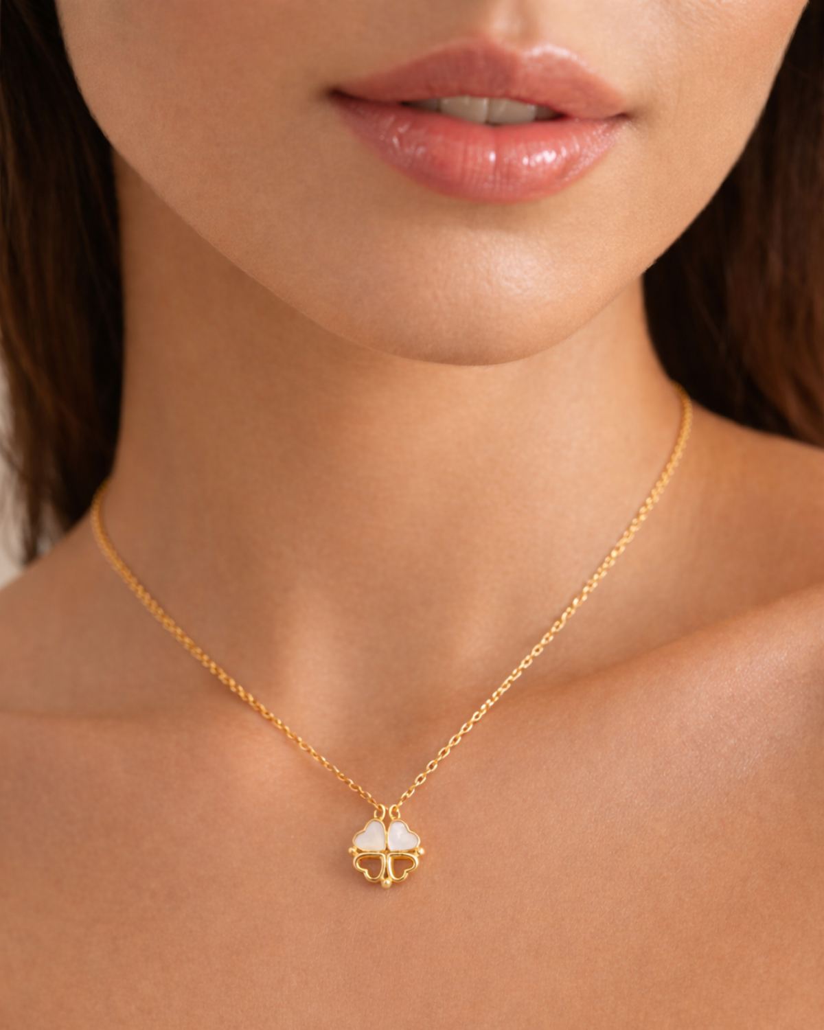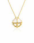 Der Anhänger besteht aus vier zarten Herzen, die zusammen ein Kleeblatt bilden können – ein wunderschönes Symbol für Liebe und Glück. Die Elemente sind mit schimmerndem Perlmutt verziert und in vergoldetes Silber gefasst.