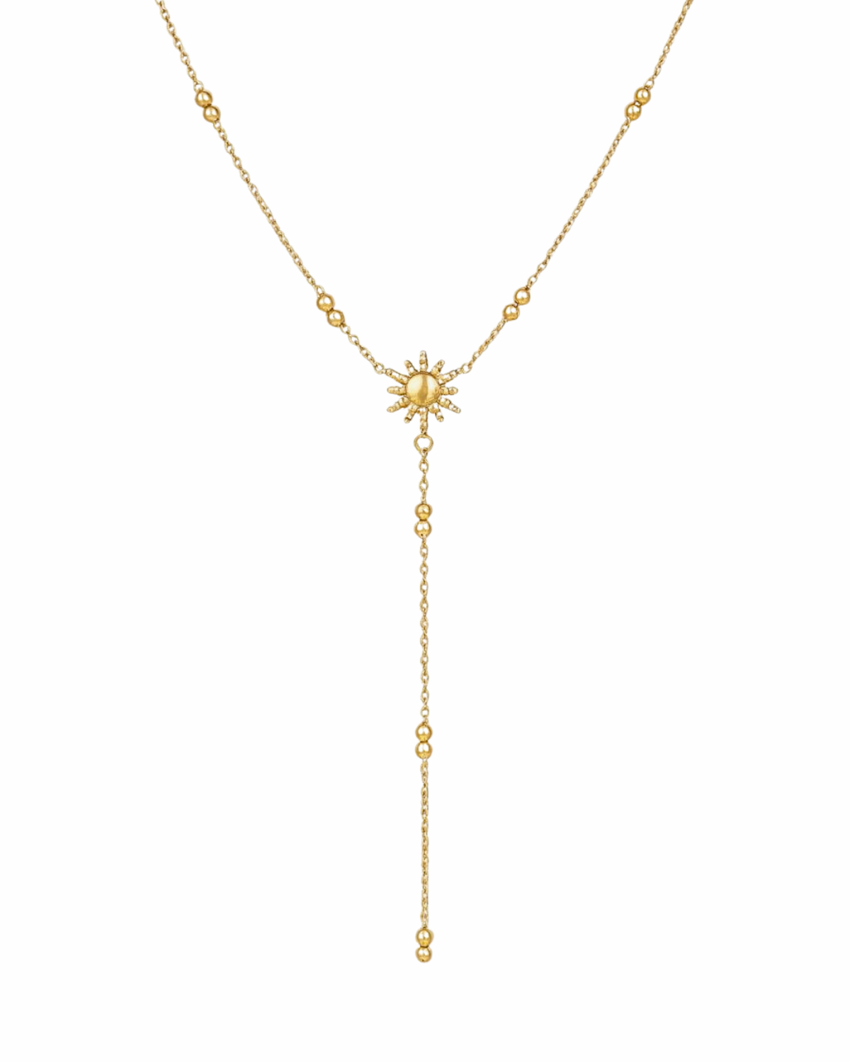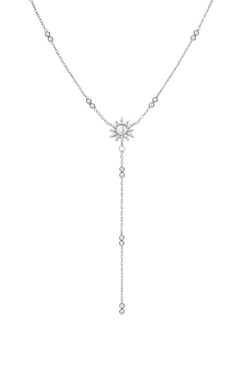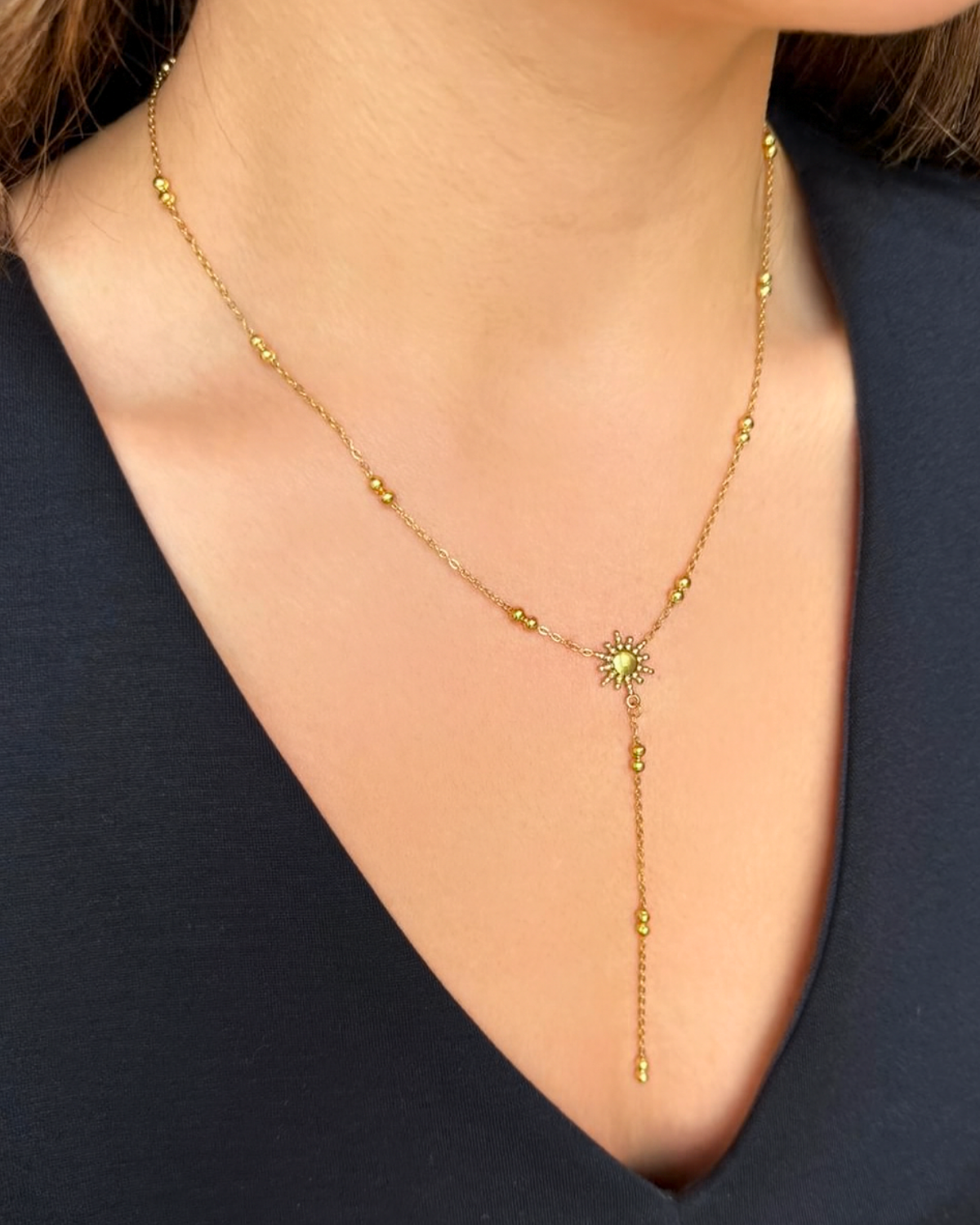 Medel besticht durch ihr sonnenförmiges Zentrum und den zarten, herabfallenden Anhänger. Ein leichtes, edles Schmuckstück, das jedem Outfit eine elegante und moderne Note verleiht – perfekt für Alltag und besondere Momente.