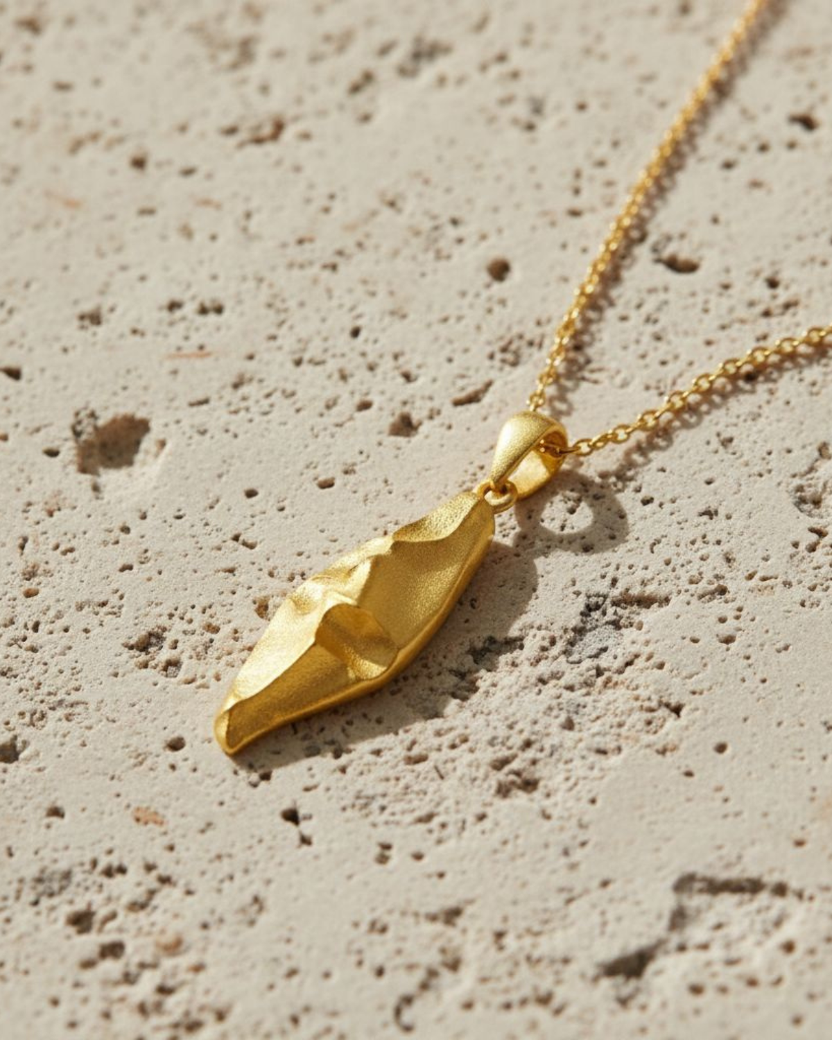 Trang vereint organische Formen mit einer markanten, strukturierten Oberfläche. Der goldene Anhänger aus hochwertigem 925 Sterling Silber ist ein echtes Statement-Piece und verleiht jedem Look eine künstlerische, natürliche Eleganz. Perfekt für alle, die besonderen Schmuck lieben, der auffällt – stilvoll, einzigartig und zeitlos.