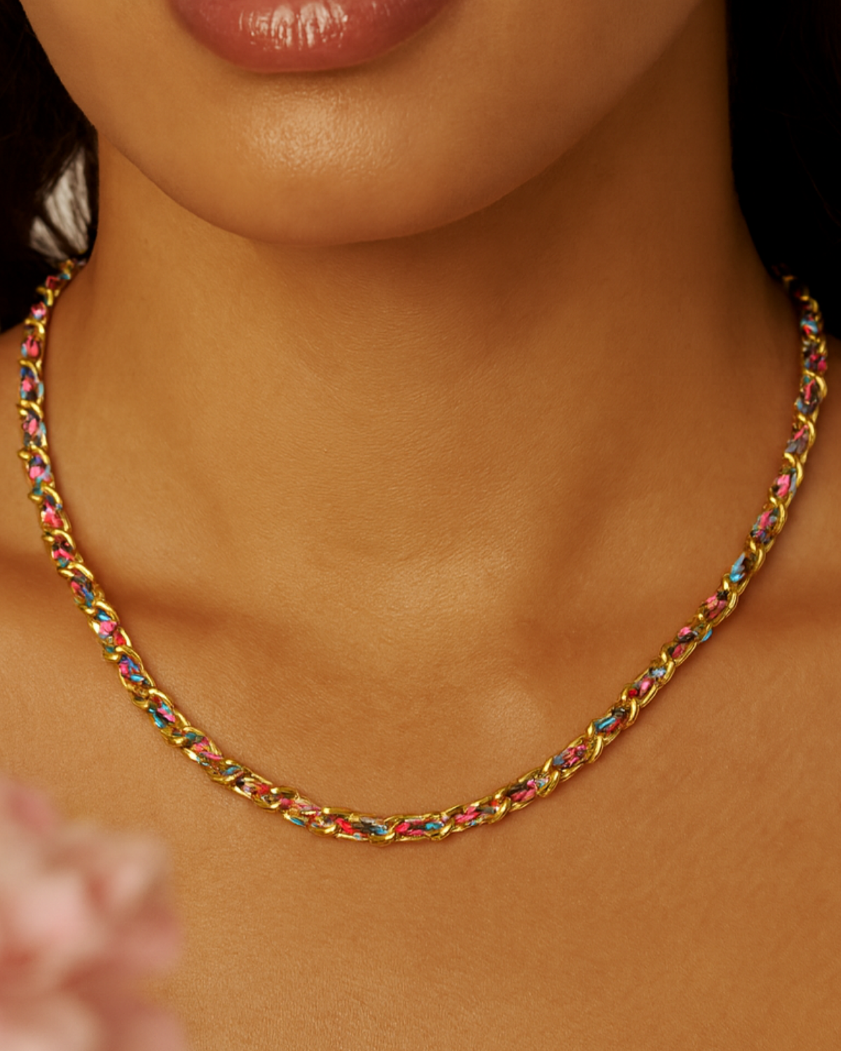 Urana kombiniert robuste Edelstahlglieder mit bunt eingeflochtenen Fäden und wird so zu einem einzigartigen Statement-Piece. Leicht, modern und verspielt – perfekt für alle, die ihrem Look einen frischen Farbakzent verleihen möchten. Durable, stylisch und bereit für jeden Tag.