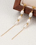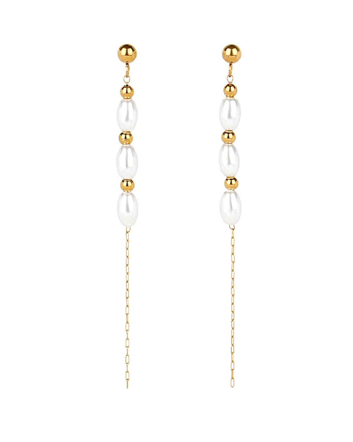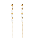 Die Deloraine Ohrhänger vereinen filigrane Leichtigkeit mit edler Ausdrucksstärke. Feine Edelstahl-Elemente in Gold harmonieren mit schimmernden, tropfenförmigen Perlen, die sanft im Licht reflektieren. Die zarte, bewegliche Kette verleiht den Ohrringen eine elegante Länge und einen fließenden, femininen Look.